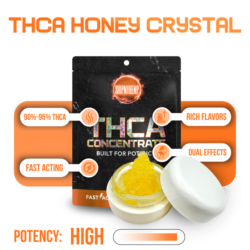 Shipmyhemp Honey Crystals deliver a high quality product for consumers, with potent flavor profiles ranging from earthy and savory to floral and sweet. it ranges from uplifting euphoria to a soothing calm depending on the strain. packaged with care for the consumer.