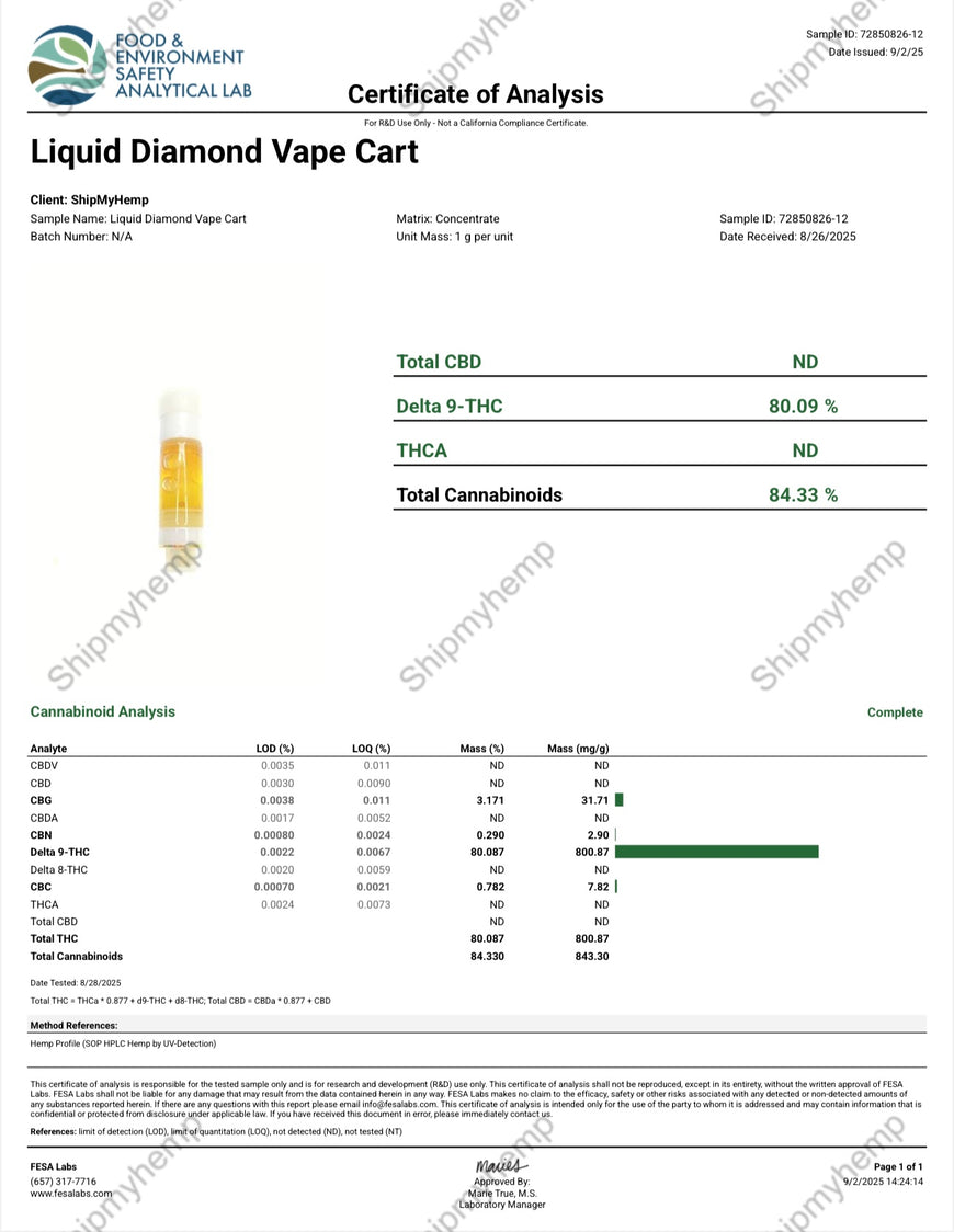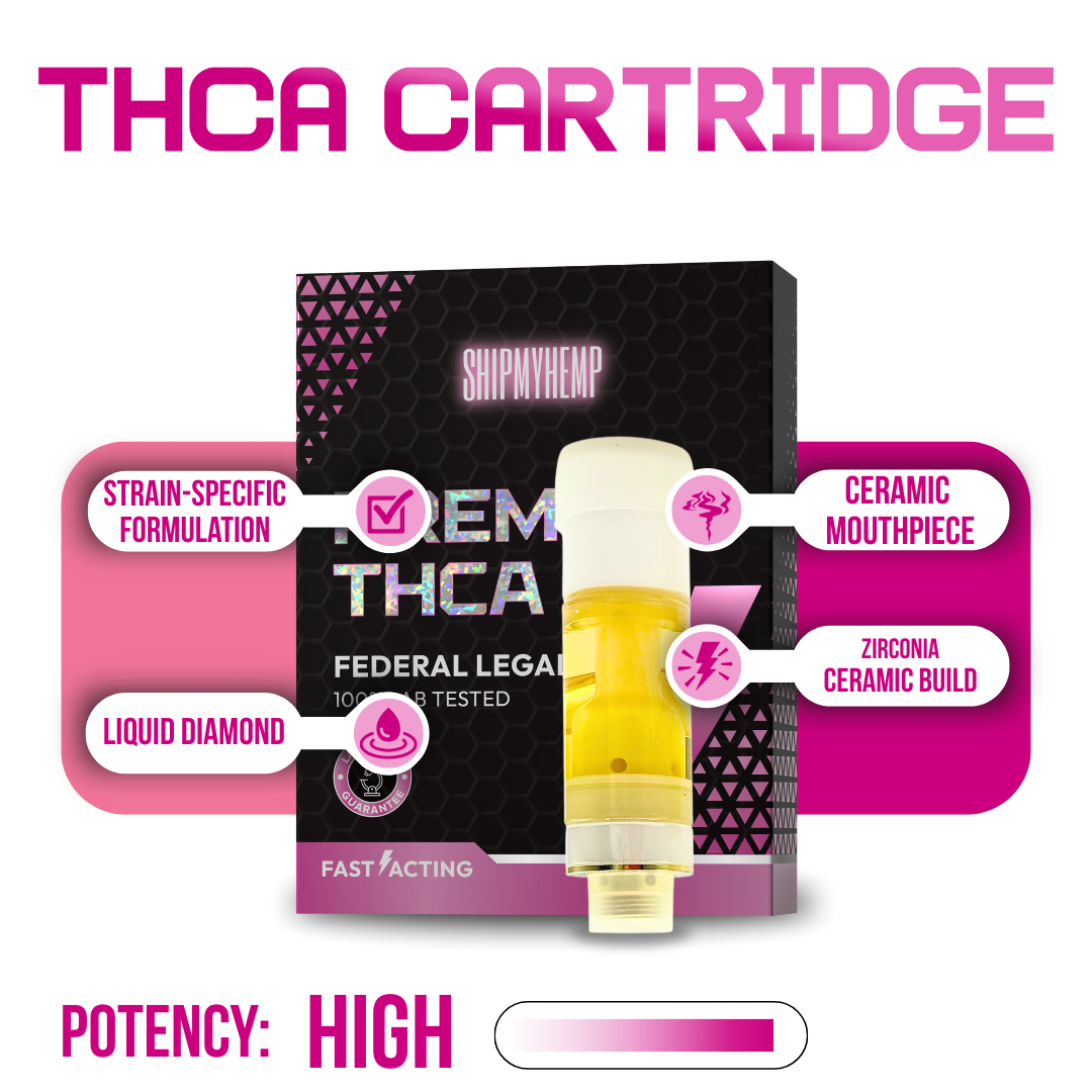 Introducing the next generation of elite vaping: Shipmyhemp's THCA Liquid Diamond Premium Vape cartridge. Each cartridge is expertly crafted, formulated and tempurature controlled based on strain and viscosity level. Shipmyhemp's product development team spent over 2 years seeking out a Top-Tier vaping cartridge to ensure an upper echelon experience. The cartridge is a wide body frame constructed of zirconia ceramic.   The extra large ceramic barrel mouth piece allows for big, tasty rips.