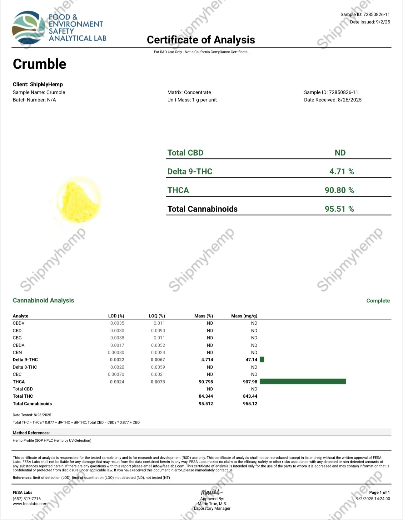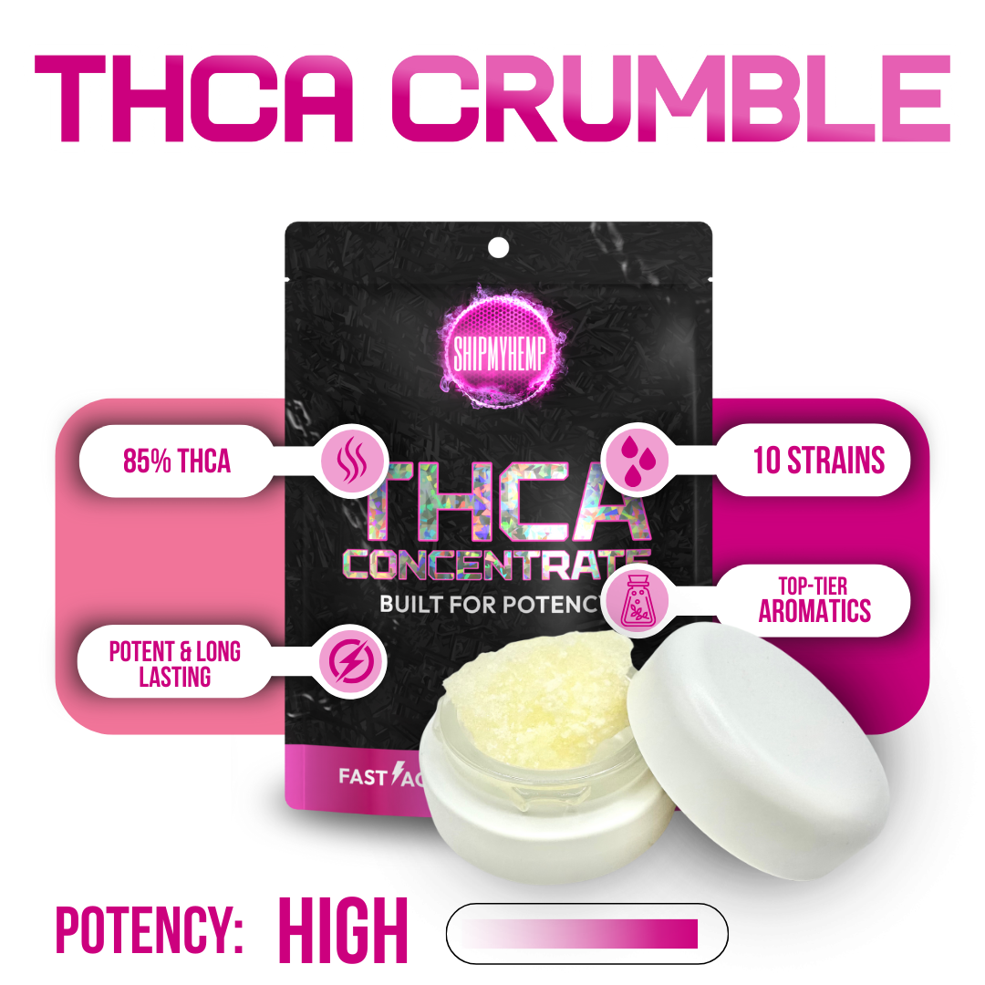 Shipmyhemp Crumble offers a robust flavor profile and some of the best aromatics in the industry. we invest the time to get top teir quality for the consumer.